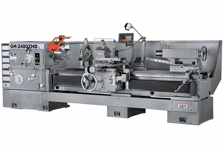 GH-2480 ZHD DRO RFS - универсальный токарно-винторезный станок промышленного класса производства компании JET. Он рассчитан на обработку массивных и тяжелых заготовок и способен выдерживать длительные нагрузки. Станок найдет применение на металлообрабатывающих производствах, в конструкторских бюро, предприятиях оборонной сферы и крупных реммастерских. Диаметр обточки над станиной стандартен для серии GH-24 и составляет 630 мм. Над поперечным суппортом можно обрабатывать детали диаметром до 370 мм, со снятым мостиком gapдо 830 мм с ограничением по длине 310 мм. Главное отличие GH-2480 ZHDDRORFS - увеличенное расстояние между центрами, у данной модели оно увеличено до 2000 мм. Для того, чтобы создать необходимый крутящий момент на шпинделе станок оснащен асинхронным электродвигателем мощностью 11 кВт, привод шпинделя погружен в масляную ванну для его охлаждения, снижения уровня шума и увеличения ресурса привода в целом. Также предусмотрена централизованная система смазки критически важных узлов и агрегатов. Автоматическая коробка подач имеет множество предустановок, выбирая которые можно выбрать необходимый режим работы, включая нарезку всех основных типов резьб. GH-2480 ZHDDRORFS установлен на высококачественную станину, отлитую по фирменной технологии JET. Жесткость конструкции обеспечивает эффективный отвод тепла от инструмента и гасит вибрации, возникающие при обточке. Станок поставляется в богатой комплектации, заказчик может немедленно провести его пусконаладку и запустить в работу.